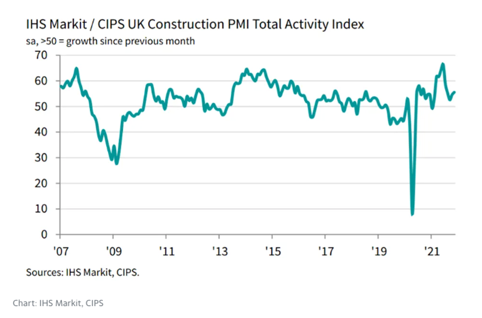 A steeper rise in commercial construction, which stood at 56.5, helped offset a slight slowdown in house building growth, which fell to 54.7 from 55.4, amid a robust rise in demand for construction products and materials. (IHS Markit / CIPS, 2021)