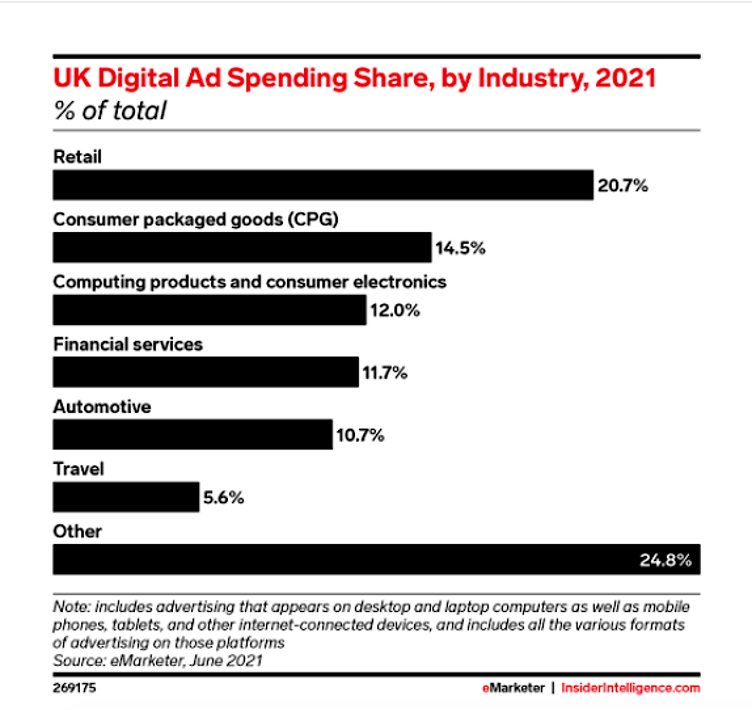 • Retail is the biggest spender in Digital Advertising for 2021, holding 20.7% of the UK Digital Ad Spending share (EMarketer, 2021).